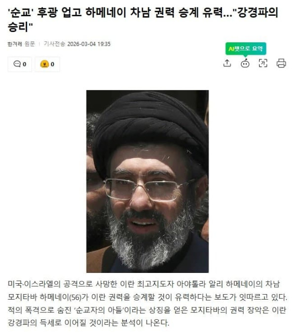 속11보 )) 하메네이 아들, 즉위 하자마자 사망