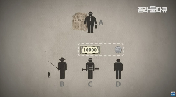 결국 은행은 D에게 500원을 대출하고 B는 이 둘에게 장사를 해서 10500원을 벌어서 갚게 됨