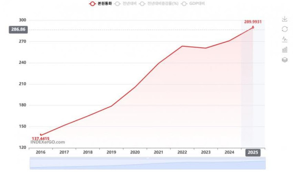 그리고 그 본원통화는 작년기준 300조 가까이 되었고 이를 현 지급준비율 7%로 계산하면 실제로 시중에 나돌아다니는 돈의 양은 5천조 가까이 된다는 뜻임 (최대 14.3배)