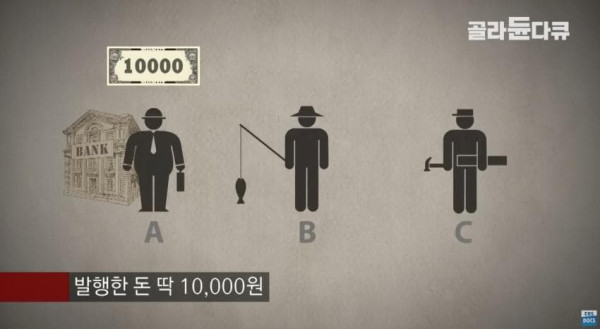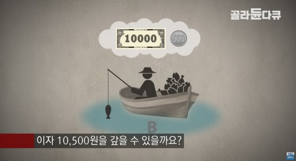 만약 고립된 섬에서 은행A가 어부B에게 만원을 빌려주고 이자 500원을 받기로 가정해보자