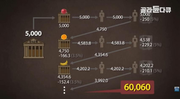 이런식으로 무한등비급수로 증가하며 시장에는 5000억원이 풀렸지만 실제로 시중에 돌아다니는 돈은 6조가 넘어가게 된다는 내용임