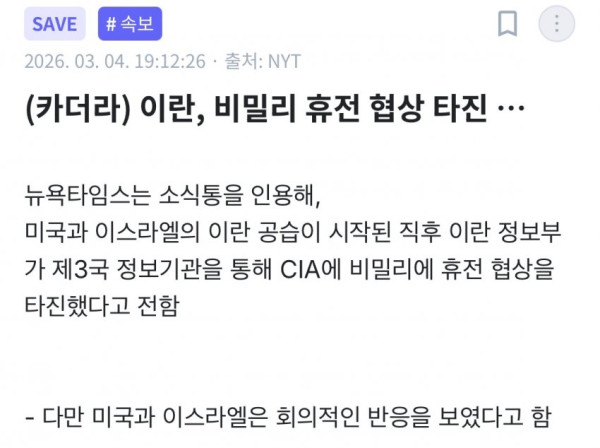 [1보] NYT "이란, 美 CIA에 비밀리에 휴전 제안"