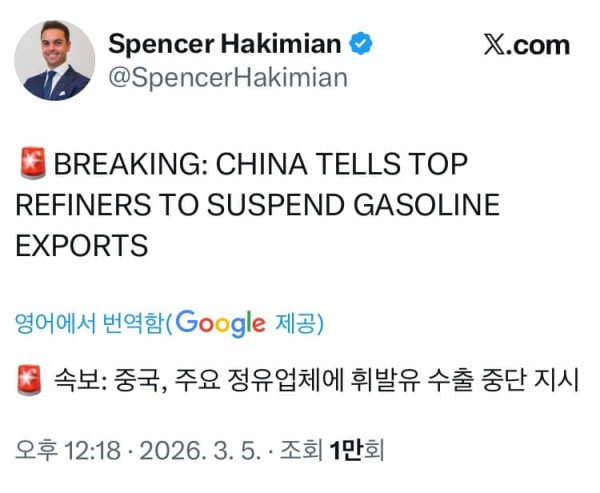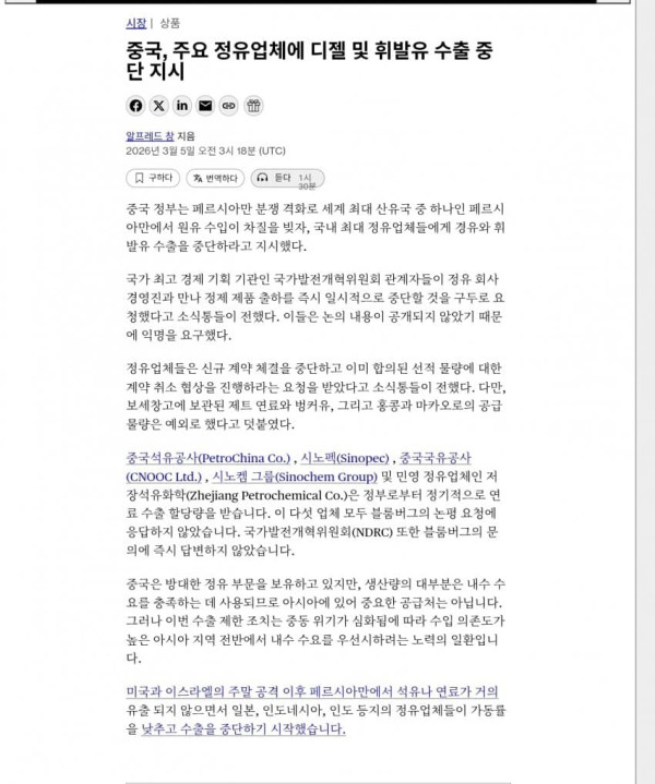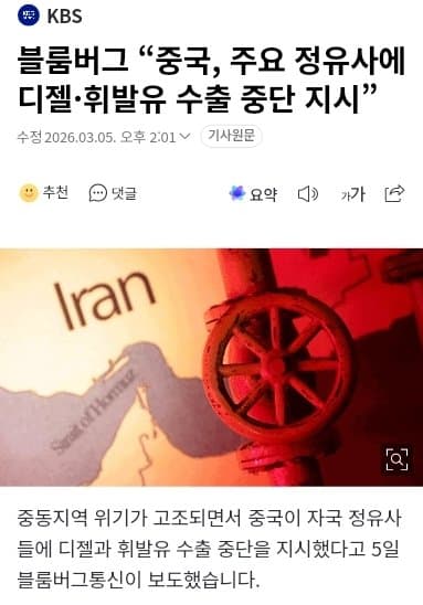 중국, 중동 여파로 디젤 및 휘발유 수출 중단 지시