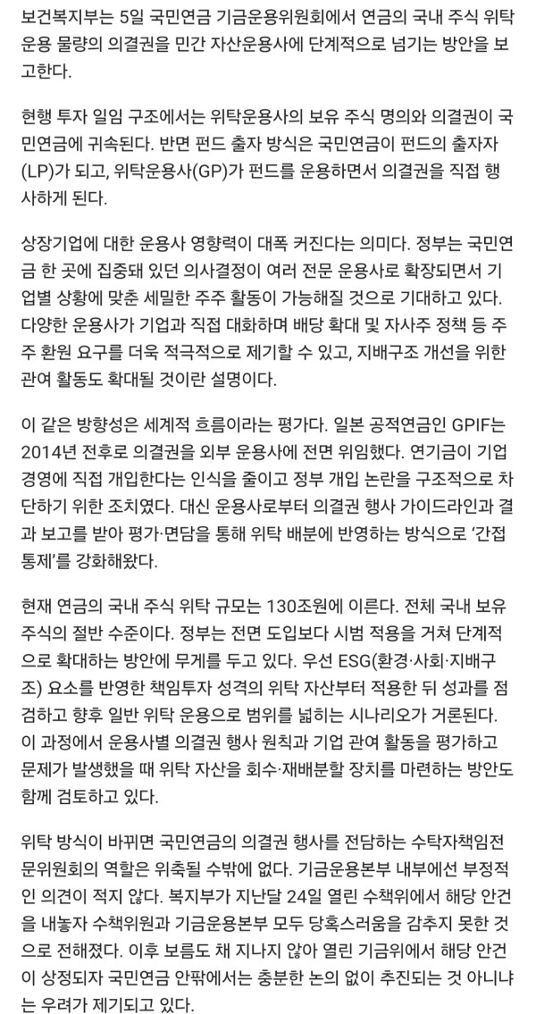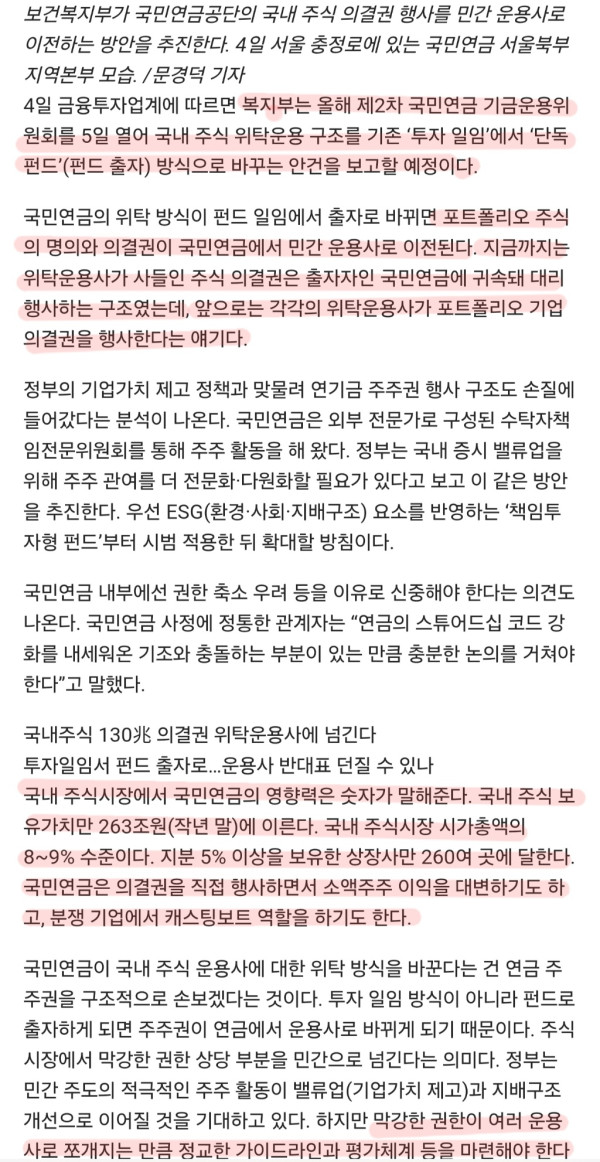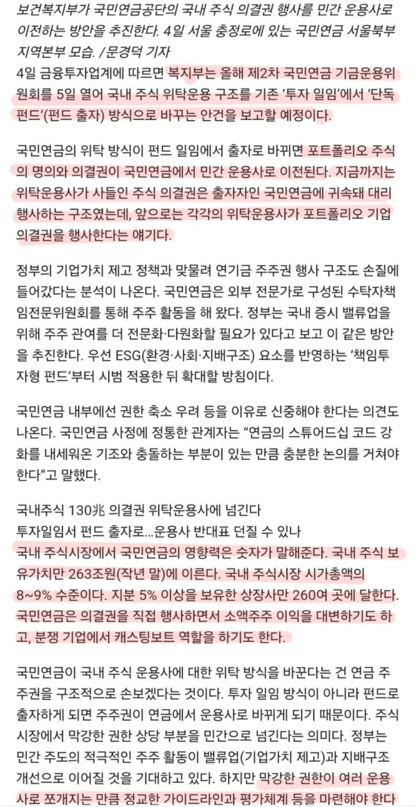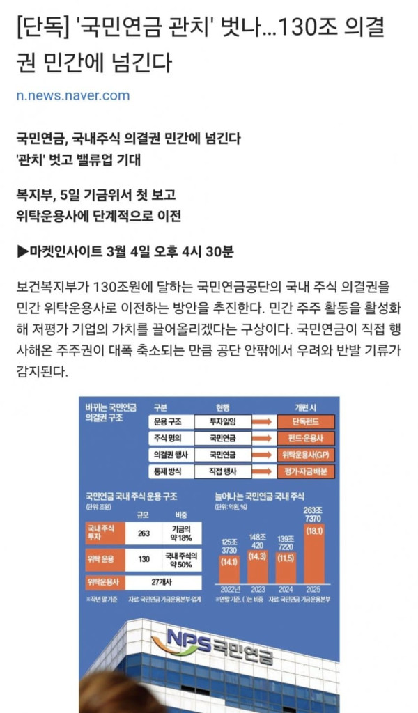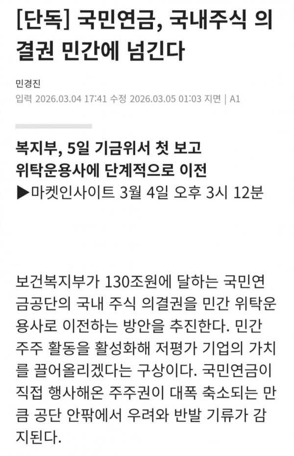 ▶마켓인사이트 3월 4일 오후 4시 30분 보건복지부가 130조원에 달하는 국민연금공단의 국내 주식 의결권을 민간 위탁운용사로 이전하는 방안을 추진한다. 민간 주주 활동을 활성화해 저평가 기업의 가치를 끌어올리겠다는