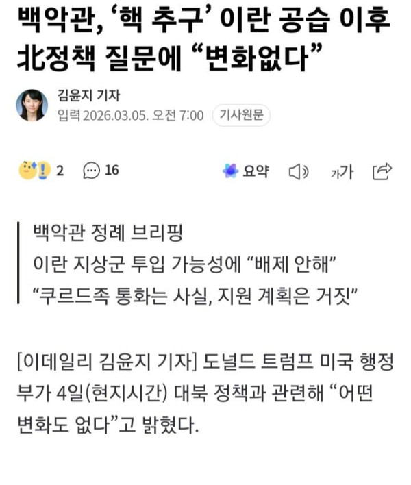 백악관, ‘핵 추구’ 이란 공습 이후 北정책 질문에 “변화없다”