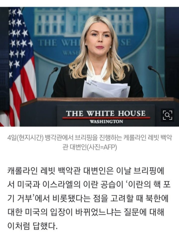 도널드 트럼프 미국 행정부가 4일(현지시간) 대북 정책과 관련해 “어떤 변화도 없다”고 밝혔다. 4일(현지시간) 뱅각관에서 브리핑을 진행하는 케롤라인 레빗 백악관 대변인(사진=AFP) 캐롤라인 레빗 백악관 대변인은