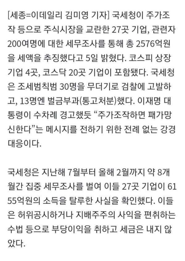 국세청이 주가조작 등으로 주식시장을 교란한 27곳 기업, 관련자 200여명에 대한 세무조사를 통해 총 2576억원을 세액을 추징했다고 5일 밝혔다. 코스피 상장기업 4곳, 코스닥 20곳 기업이 포함됐다. 국세청은 조