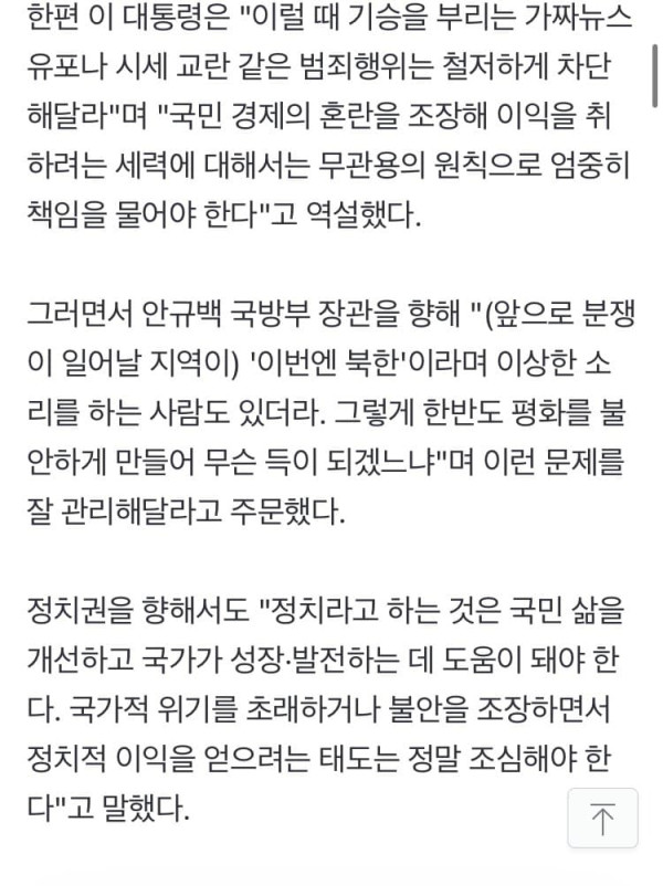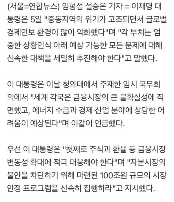 "100조원대 금융안정 조치 신속집행…재생에너지로 대대적 전환" "가짜뉴스 철저히 차단…'이번엔 북한' 같은 얘기, 무슨 득 되나" "혼란 조장세력 무관용…불안 조장해 정치적 이익 얻으려 하면 안 돼" (서울=연합뉴