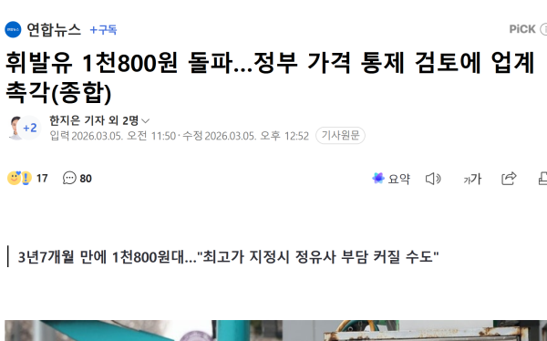 [단독] 중동 사태에 유가 '들썩'…서울 휘발유값 1,800원 돌파