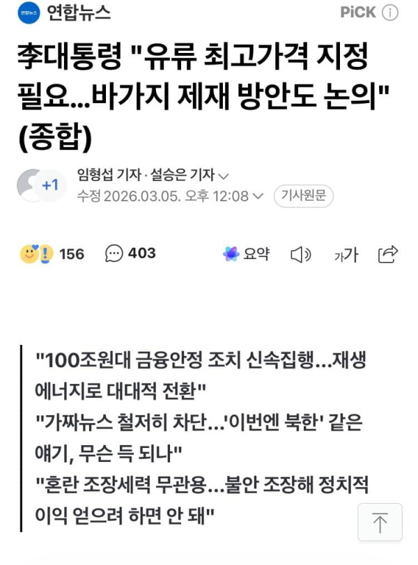 李대통령 "유류 최고가격 지정 필요…바가지 제재 방안도 논의"
