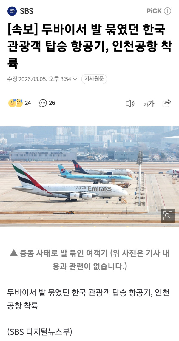 두바이서 발 묶였던 한국 관광객 탑승 항공기, 인천공항 착륙