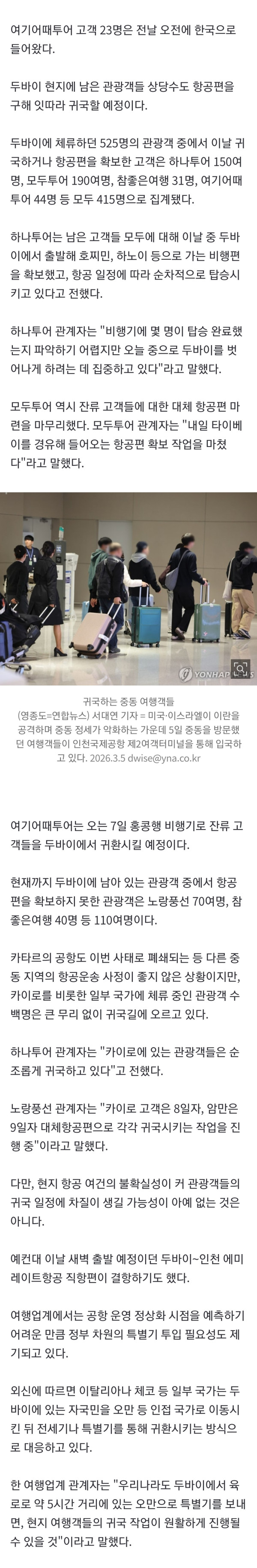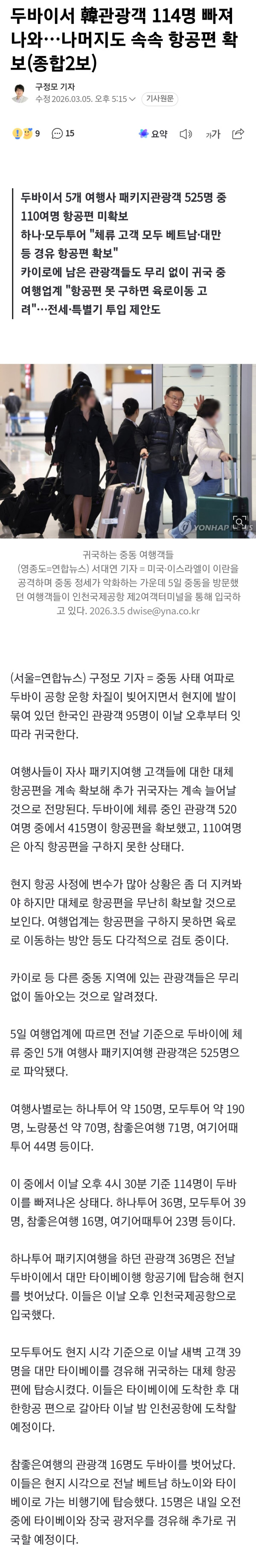 두바이에서 한국인 관광객 114명 빠져나왔다
