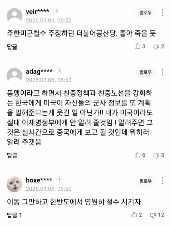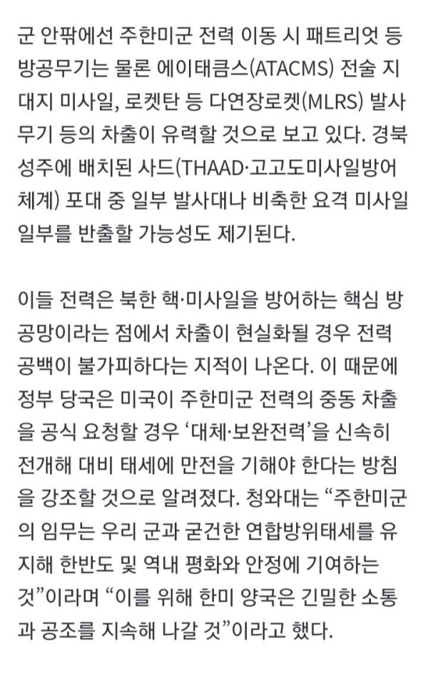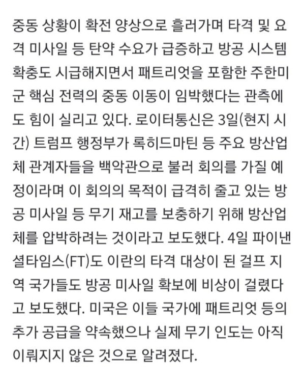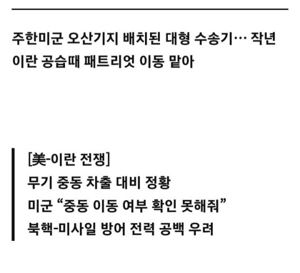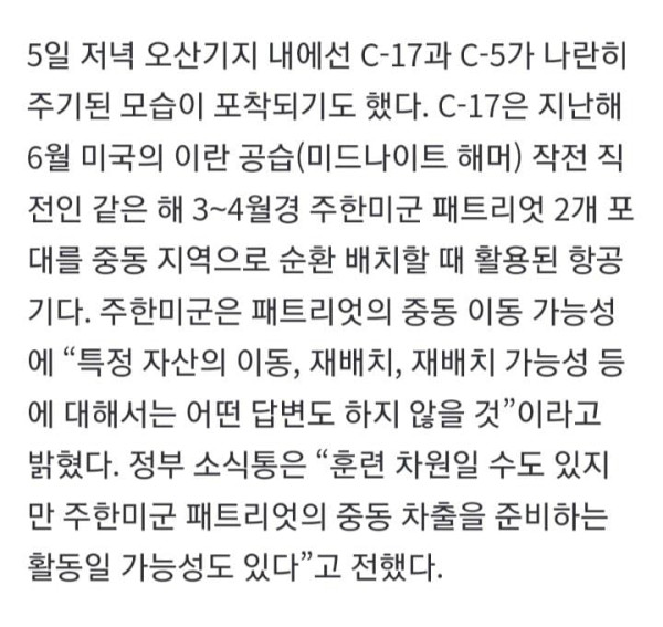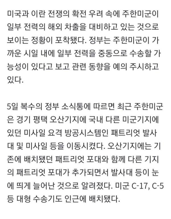 미국과 이란 전쟁의 확전 우려 속에 주한미군이 일부 전력의 해외 차출을 대비하고 있는 것으로 보이는 정황이 포착됐다. 정부는 주한미군이 가까운 시일 내에 일부 전력을 중동으로 수송할 가능성이 있다고 보고 관련 동향을