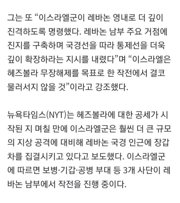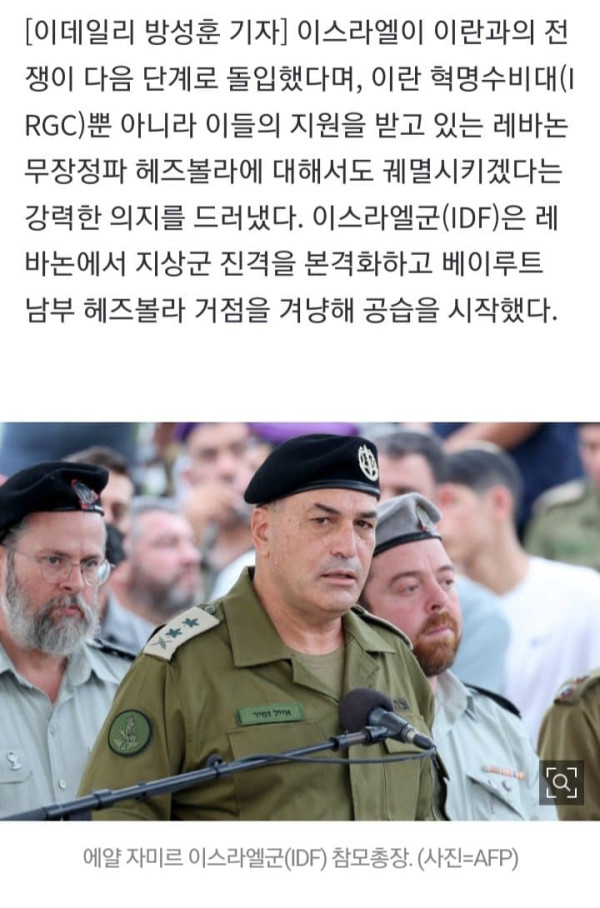 이스라엘이 이란과의 전쟁이 다음 단계로 돌입했다며, 이란 혁명수비대(IRGC)뿐 아니라 이들의 지원을 받고 있는 레바논 무장정파 헤즈볼라에 대해서도 궤멸시키겠다는 강력한 의지를 드러냈다. 이스라엘군(IDF)은 레바논