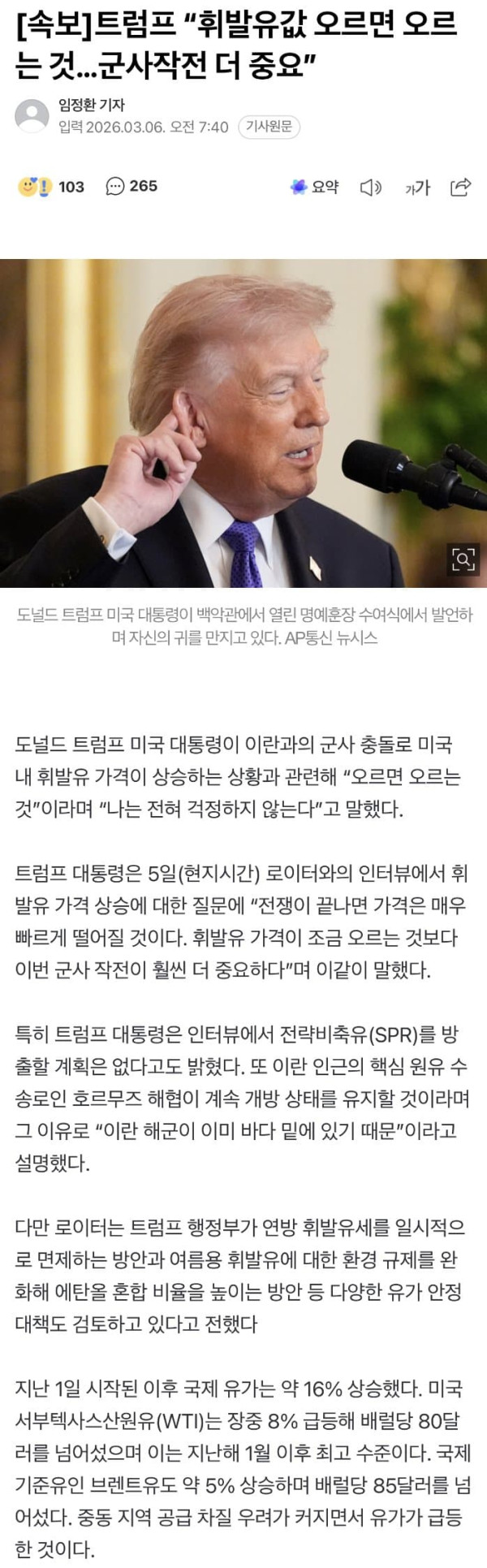 속보) 트럼프 유가 안정화 추가조치 임박