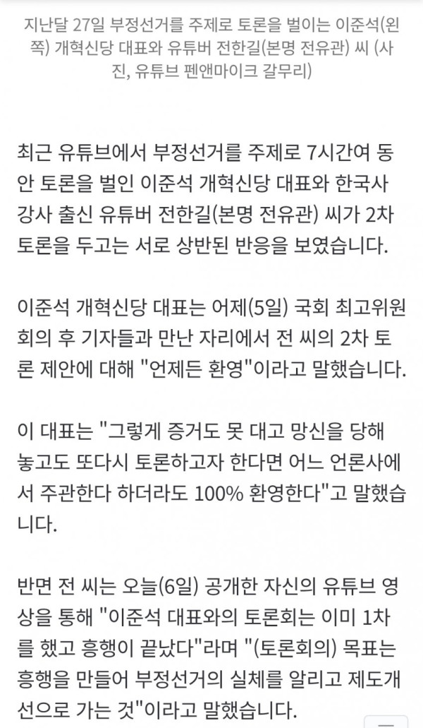 부정선거 2차 토론 이준석 "환영".. 전한길 "난 안 나간다"