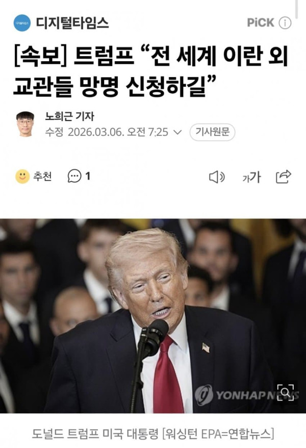 [속보] 트럼프 "전 세계 이란 외교관들 망명 신청해라"