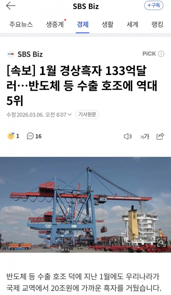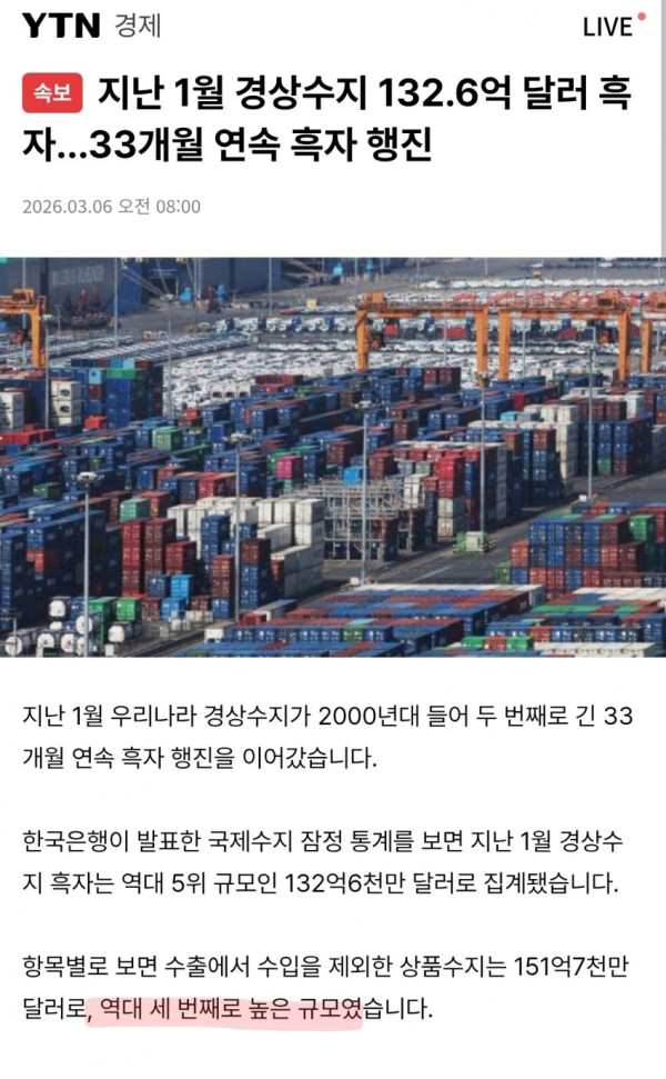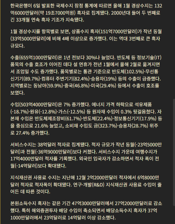 속보) 지난 1월 경상수지 132.6억 달러 흑자 행진ㅋㅋㅋ