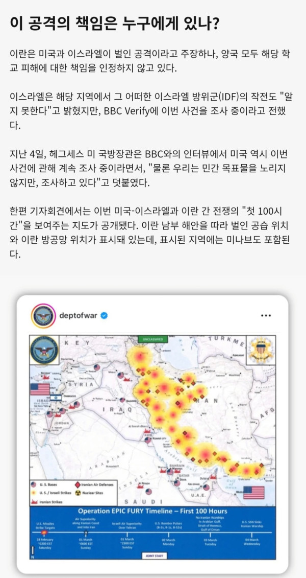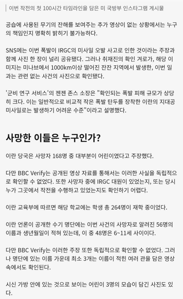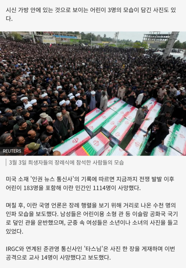 이란 당국은 지난 2월 28일 발생한 이 공격으로 168명이 사망했다고 밝혔다.