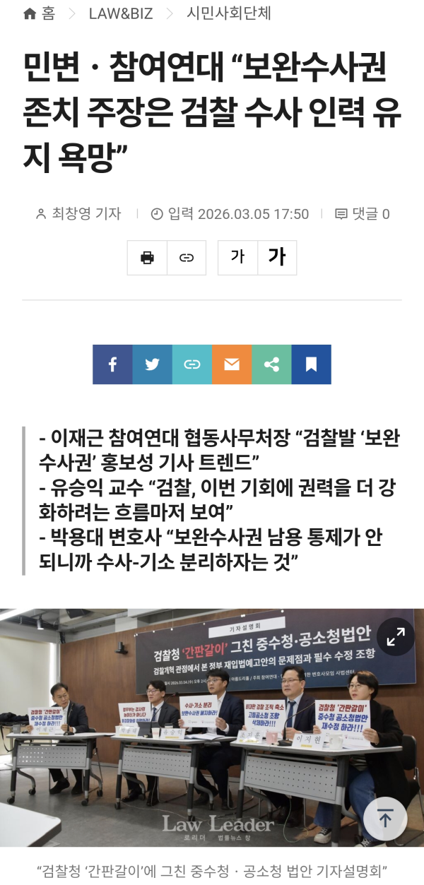 [로리더] 민주사회를 위한 변호사모임(민변) 사법센터와 참여연대는 “공소청법은 수사권 및 보완수사권 폐지 등 형사소송법 개정 바탕 위에서 함께 제정돼야 한다”면서 “보완수사권이 존치돼 있는 형사소송법을 그대로 두고, 공소청법을 먼저 개정하고자 하는 것은 수사권 또는 보완수사권을 존치시키겠다는 의도로 의심될 수밖에 없다”고 꼬집었다.민변 사법센터와 참여연대는 4일 오후 2시, 참여연대 아름드리홀에서 “검찰청 ‘간판갈이’에 그친 중수청ㆍ공소청 법안 기자설명회”를 개최하고 검찰개혁의 관점에서 정부 재입법예고안의 문제점과 필수 수정 조항을