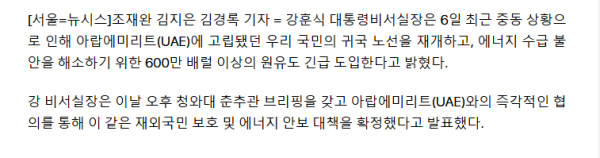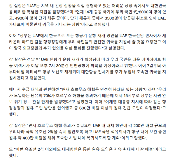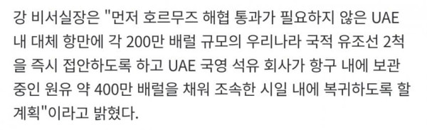 :호르무즈 해협 통과가 필요 없는 uae 내 대체 항만에 각 200만 배럴 규모의 한국 국적 유조선 즉시 접안 및 uae 국영 석유 회사로부터 400만 배럴 이상의 석유를 공급받아 asap 한국 복귀 예정