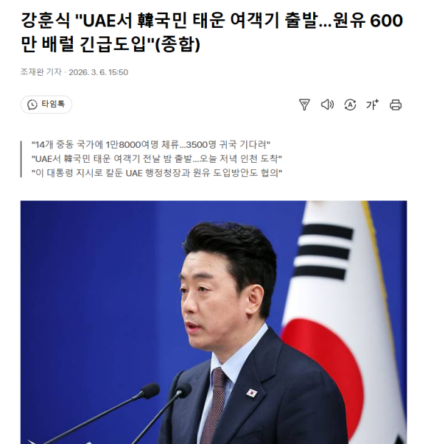[서울=뉴시스]조재완 김지은 김경록 기자 = 강훈식 대통령비서실장은 6일 최근 중동 상황으로 인해 아랍에미리트(UAE)에 고립됐던 우리 국민의 귀국 노선을 재개하고, 에너지 수급 불안을 해소하기 위한 600만 배럴 이상의 원유도 긴급 도입한다고 밝혔다. 강 비서실장은 이날 오후 청와대 춘추관 브리핑을 갖고 아랍에미리트(UAE)와의 즉각적인 협의를 통해