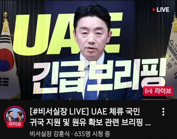 (26.3.6. KTV LIVE) UAE 체류 국민 귀국 지원 및 원유 확보 관련 강훈식 비서실장 브리핑