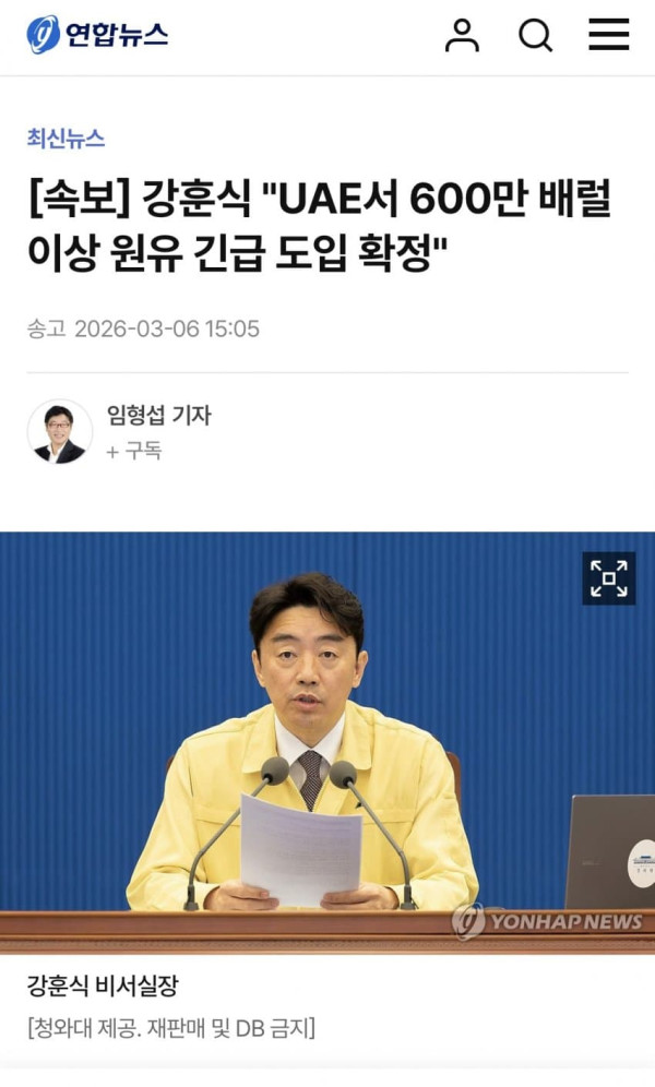 강훈식,UAE서 600만 배럴 이상 원유 긴급 도입 확정"