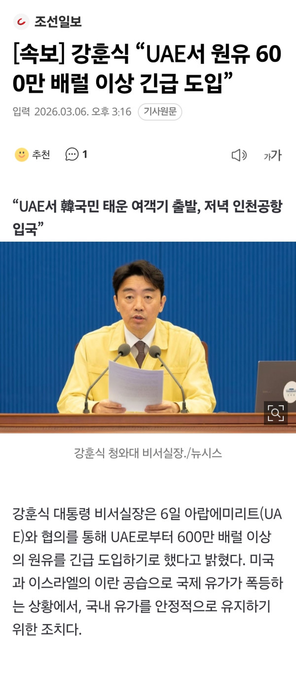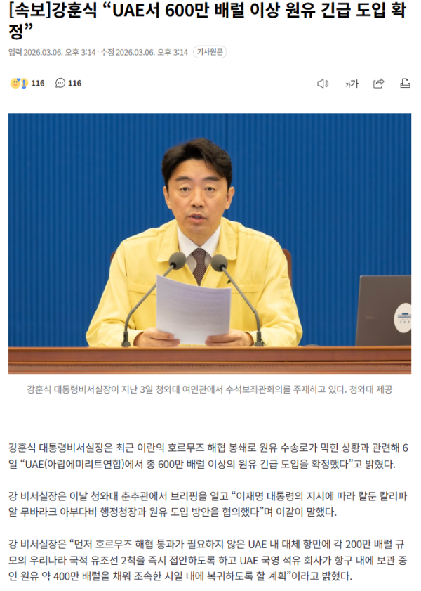 강훈식 대통령 비서실장이 6일 아랍에미리트(UAE)와 협의를 통해 UAE로부터 600만 배럴 이상의 원유를 긴급 도입하기로 했다고 밝혔다. 강 비서실장은 이날 청와대 춘추관에서 브리핑을 열고 "이재명 대통령의 지시에