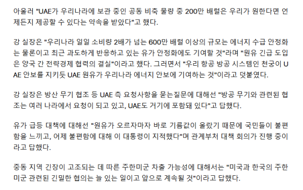 4. 더불어 uae가 국내 보관 중인 공동 비축유 중 200만 배럴은 한국 요청 시 언제든지 공급 가능하다는 약속 받음