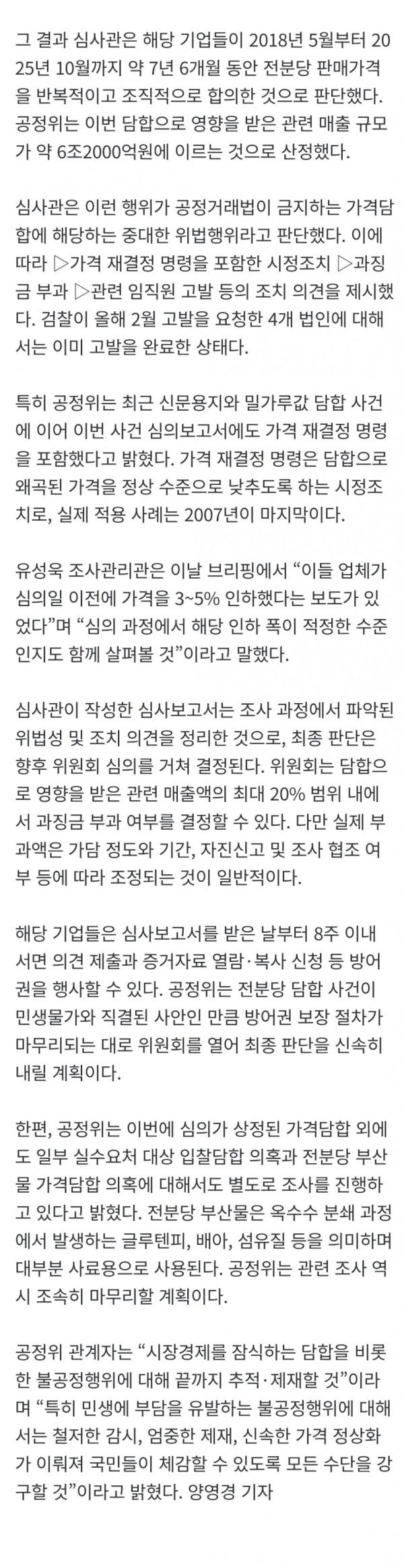 지난해 10월부터 올해 3월 초까지 조사를 진행한 결과, 심사관은 이들 업체가 2018년 5월경부터 7년 6개월에 걸쳐 반복적·조직적으로 전분당 판매가격 담합행위를 했다고 판단했습니다.