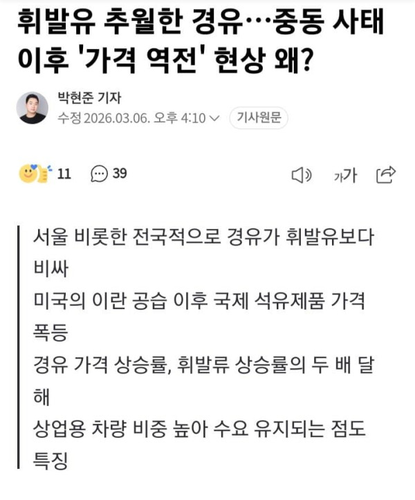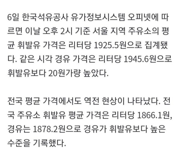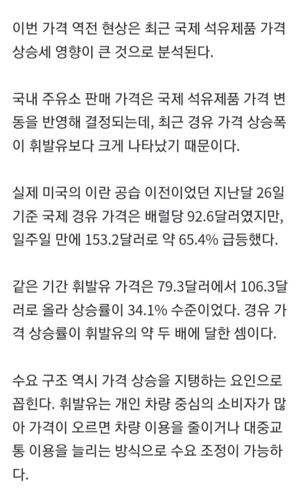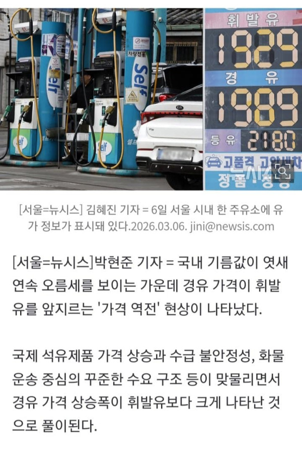 국내 기름값이 엿새 연속 오름세를 보이는 가운데 경유 가격이 휘발유를 앞지르는 '가격 역전' 현상이 나타났다. 국제 석유제품 가격 상승과 수급 불안정성, 화물 운송 중심의 꾸준한 수요 구조 등이 맞물리면서 경유 가격
