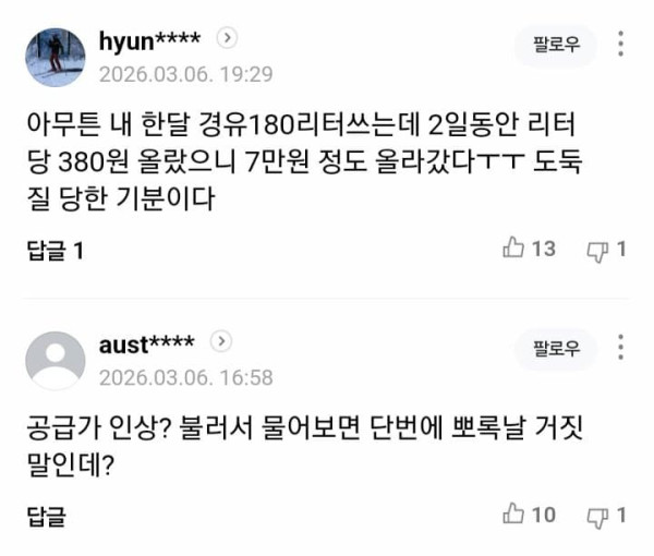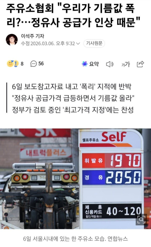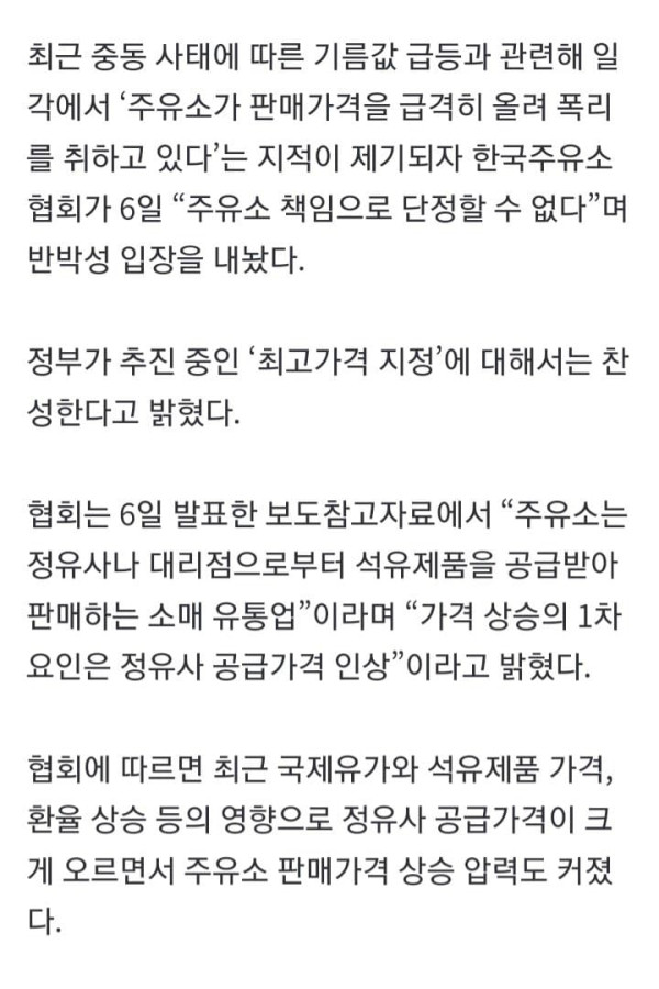 최근 중동 사태에 따른 기름값 급등과 관련해 일각에서 ‘주유소가 판매가격을 급격히 올려 폭리를 취하고 있다’는 지적이 제기되자 한국주유소협회가 6일 “주유소 책임으로 단정할 수 없다”며 반박성 입장을 내놨다. 정부가