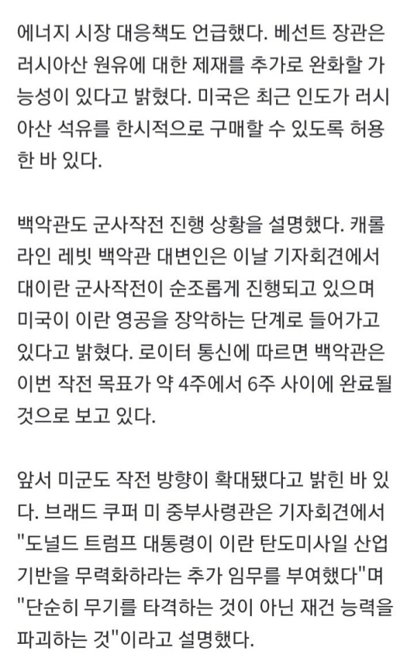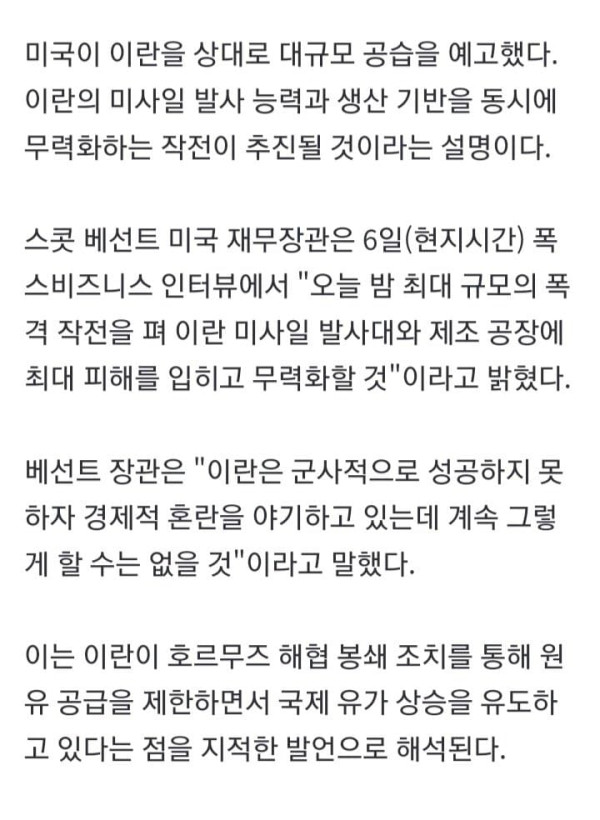 미국이 이란을 상대로 대규모 공습을 예고했다. 이란의 미사일 발사 능력과 생산 기반을 동시에 무력화하는 작전이 추진될 것이라는 설명이다. 스콧 베선트 미국 재무장관은 6일(현지시간) 폭스비즈니스 인터뷰에서 "오늘 밤