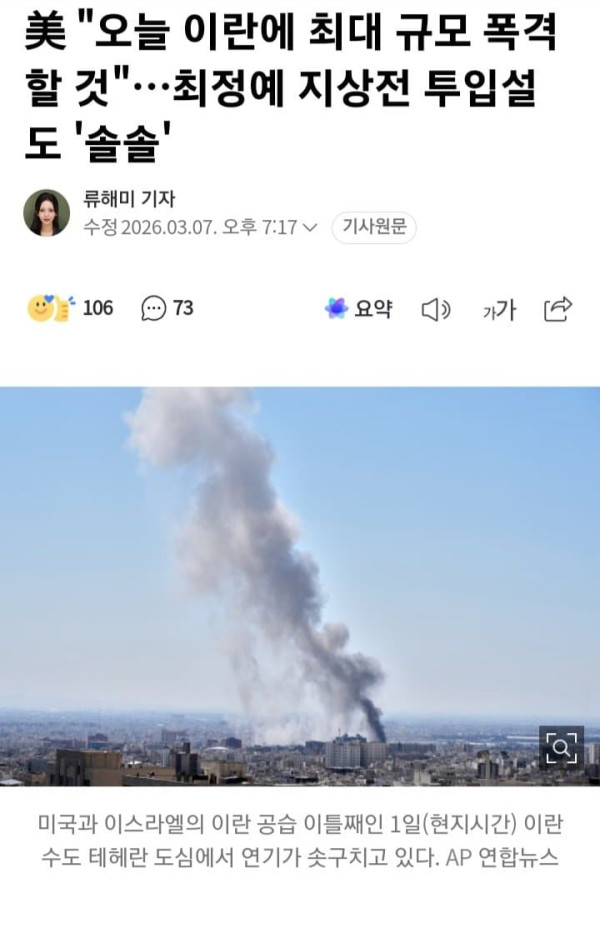 美 "오늘 이란에 최대 규모 폭격할 것"…지상전 투입설도 '솔솔'