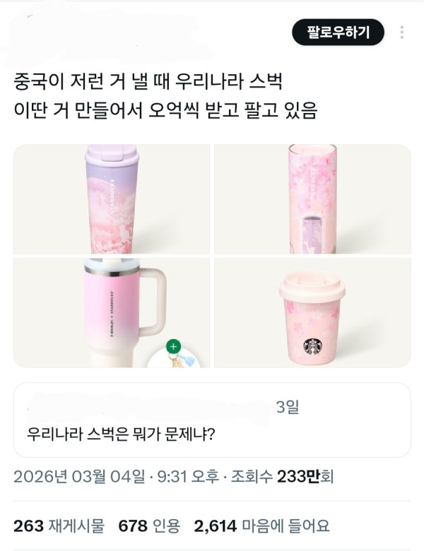 이걸본 사람들이 한국 스타벅스 md는 병신같다고 국적바꾸고싶다며 여초식 근들갑 시전함