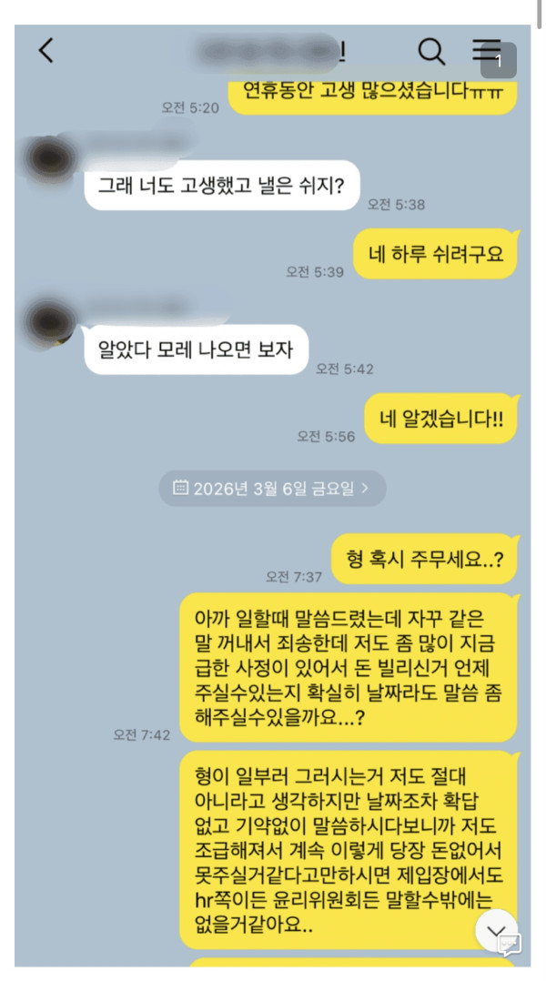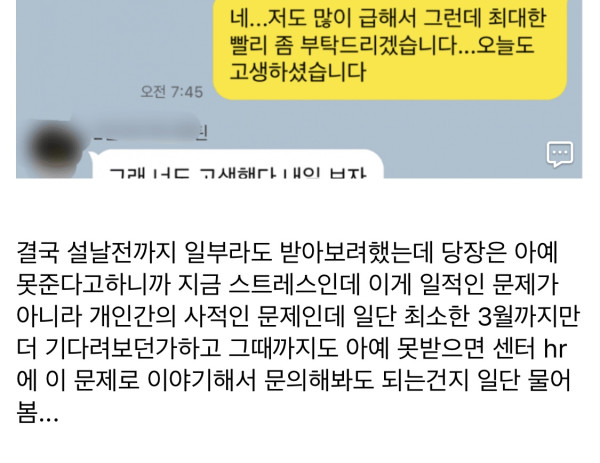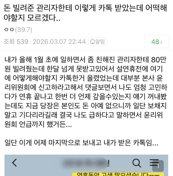 내가 올해 1월 초에 일하면서 좀 친해진 관리자한테 80만원 빌려줬는데 한달 넘게 못받고있어서 설연휴전에 여기에 어떻게해야할지 카톡한거 올렸었는데 대부분 본사 윤리위원회에 신고하라고해서 댓글보면서 나도 엄청 고민하다가