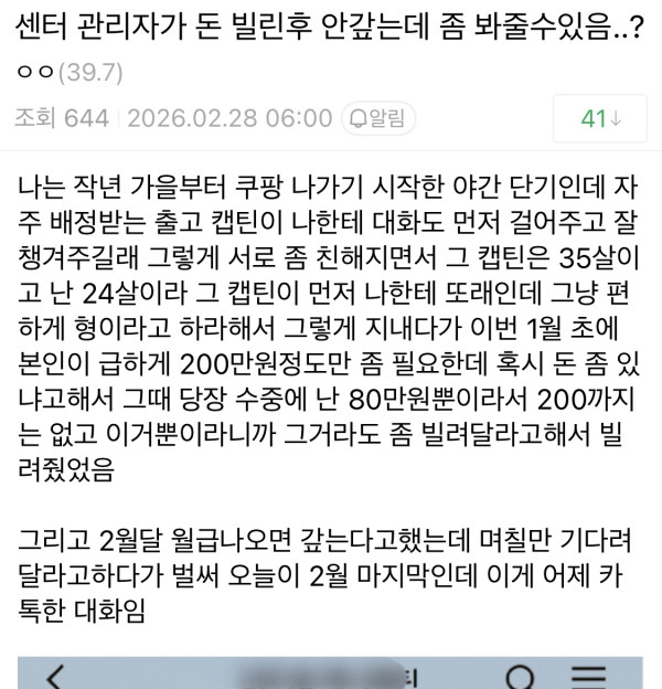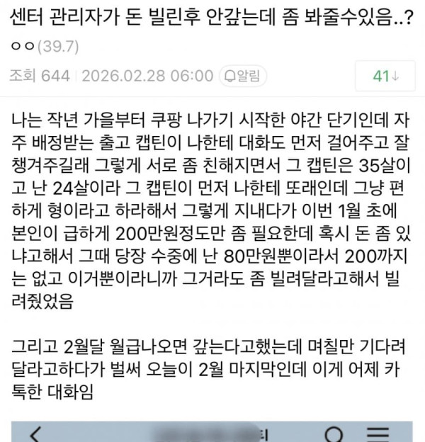 직장 관리자한테 돈 빌려주고 곤란해진 쿠팡남.jpg