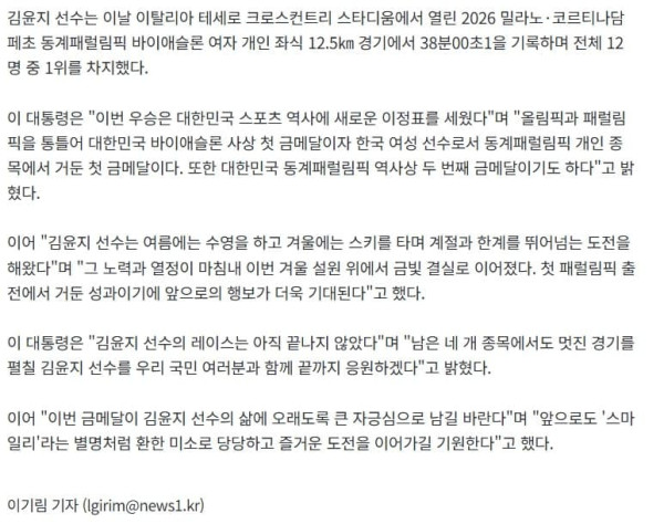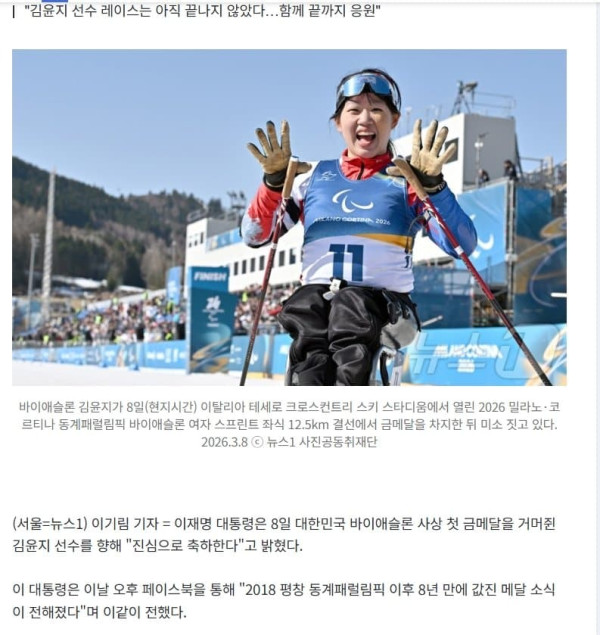 바이애슬론 김윤지가 8일(현지시간) 이탈리아 테세로 크로스컨트리 스키 스타디움에서 열린 2026 밀라노·코르티나 동계패럴림픽 바이애슬론 여자 스프린트 좌식 12.5km 결선에서 금메달을 차지한 뒤 미소 짓고 있다. 2026.3.8 ⓒ 뉴스1 사진공동취재단(서울=뉴스1) 이기림 기자 = 이재명 대통령은 8일 대한민국 바이애...