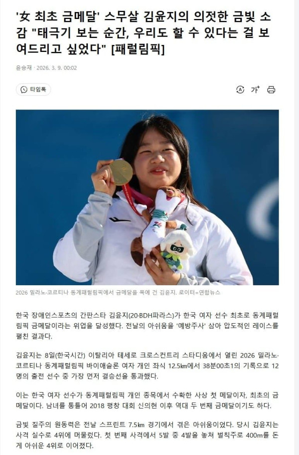 속보) 김윤지 한국 동계패럴림픽 사상 첫 여자 금메달