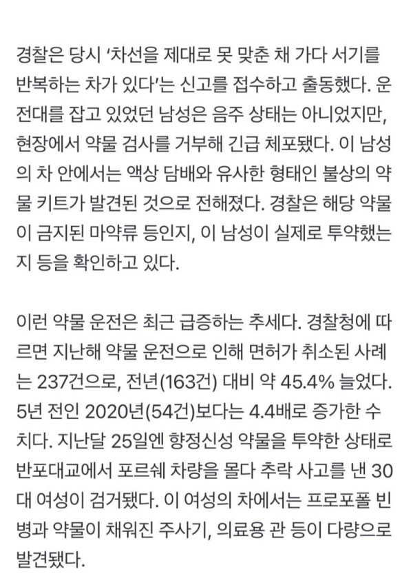 서울 용산구에서 벤틀리 차량을 몰던 30대 남성이 약물 운전 혐의로 경찰에 붙잡힌 사실이 뒤늦게 알려졌다. 차량 안에선 액상 담배와 유사한 형태의 약물 키트가 발견됐다. 약물 운전으로 논란이 됐던 ‘반포대교 포르쉐