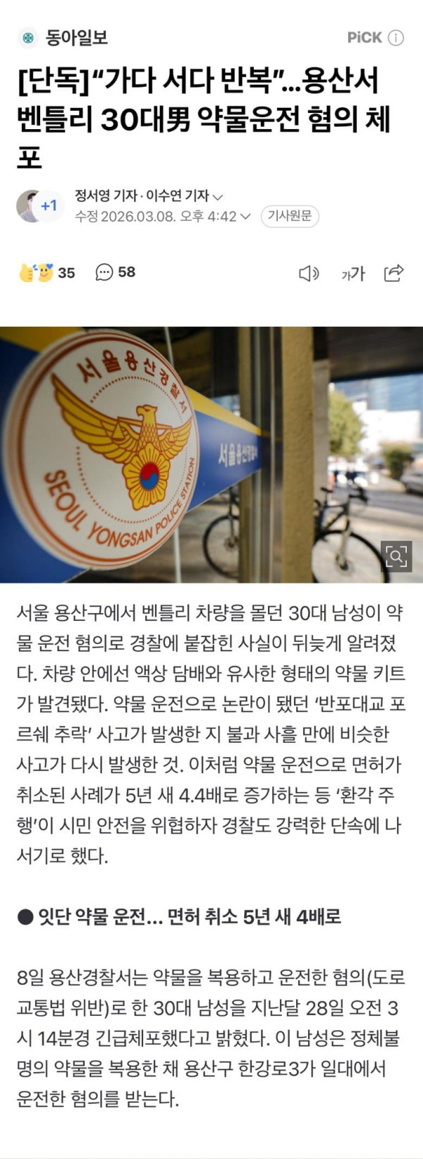 [단독]“가다 서다 반복”…용산서 벤틀리 30대男 약물운전 혐의 체포
