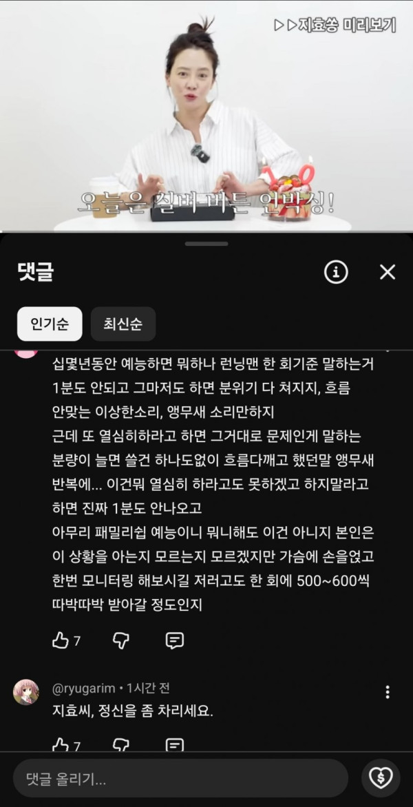 송지효 유튜브 댓글 점점 민심 10창 나는중