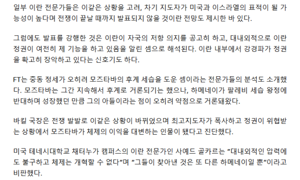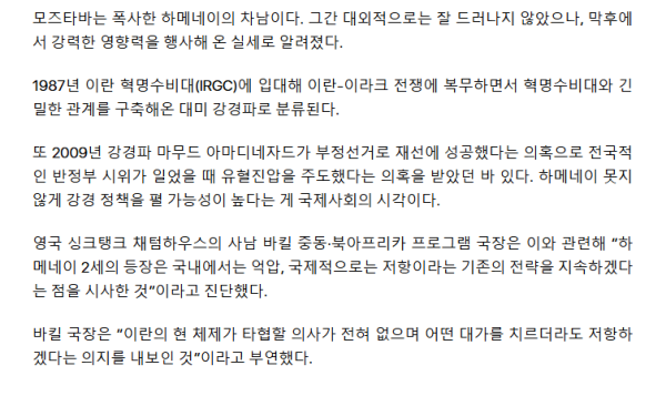 이란이 숨진 아야톨라 세예드 알리 하메네이 최고지도자의 차남 모즈타바 하메네이(56)를 차기 지도자로 선택한 것은 결사 항전 의지를 표명한 것이란 게 외신과 전문가들의 분석이다. 미국과 이스라엘이 ‘누가 후계자가 되든 제거하겠다’며 위협했음에도 강경파로 평가받는 인물을 사령탑으로 내세우며 대응에 나서겠다는 의지를 대외적으로 내비친 셈이란 분석이다. 미국 월