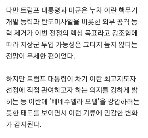 하메네이 죽였지만 하메네이 2세 집권해 '항전의지' 고수 '베네수엘라 모델' 염두에 둔 정권교체 또는 순치에 눈독 공수부대 차출설…무기급 우라늄 압수 위한 핀셋투입 우선 거론 (서울=연합뉴스) 차대운 기자 = 이란이