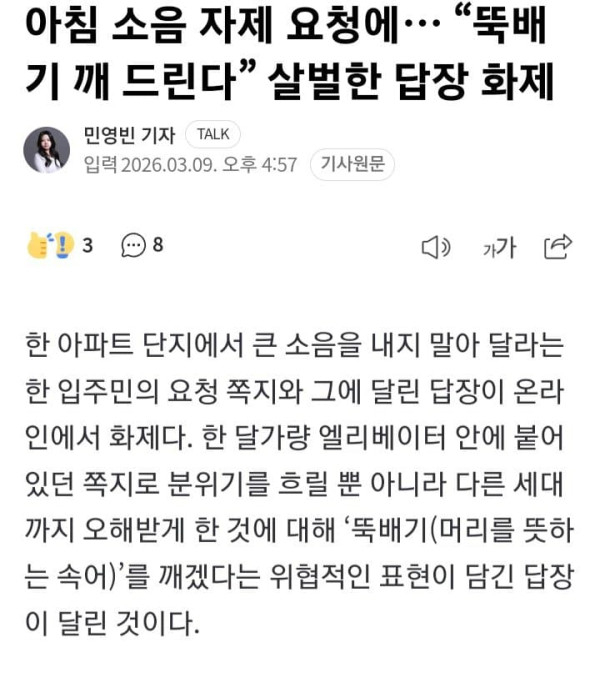 아침 소음 자제 요청에… “뚝배기 깨 드린다” 살벌한 답장 화제