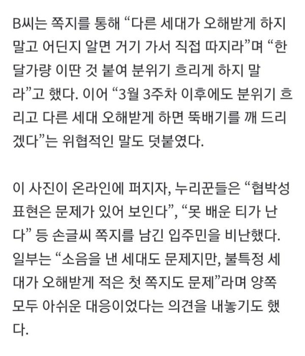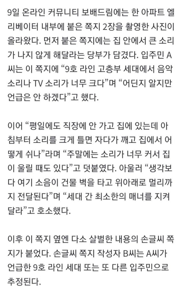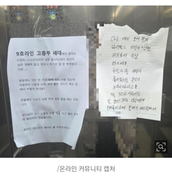 한 아파트 단지에서 큰 소음을 내지 말아 달라는 한 입주민의 요청 쪽지와 그에 달린 답장이 온라인에서 화제다. 한 달가량 엘리베이터 안에 붙어 있던 쪽지로 분위기를 흐릴 뿐 아니라 다른 세대까지 오해받게 한 것에 대