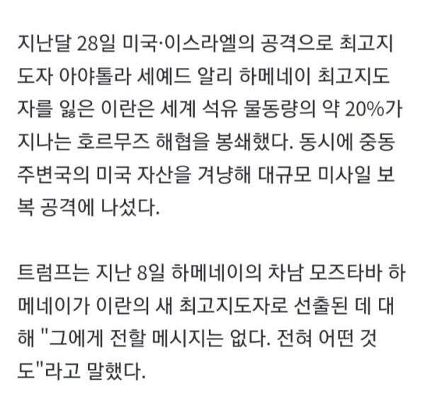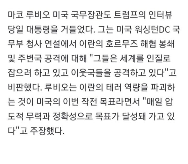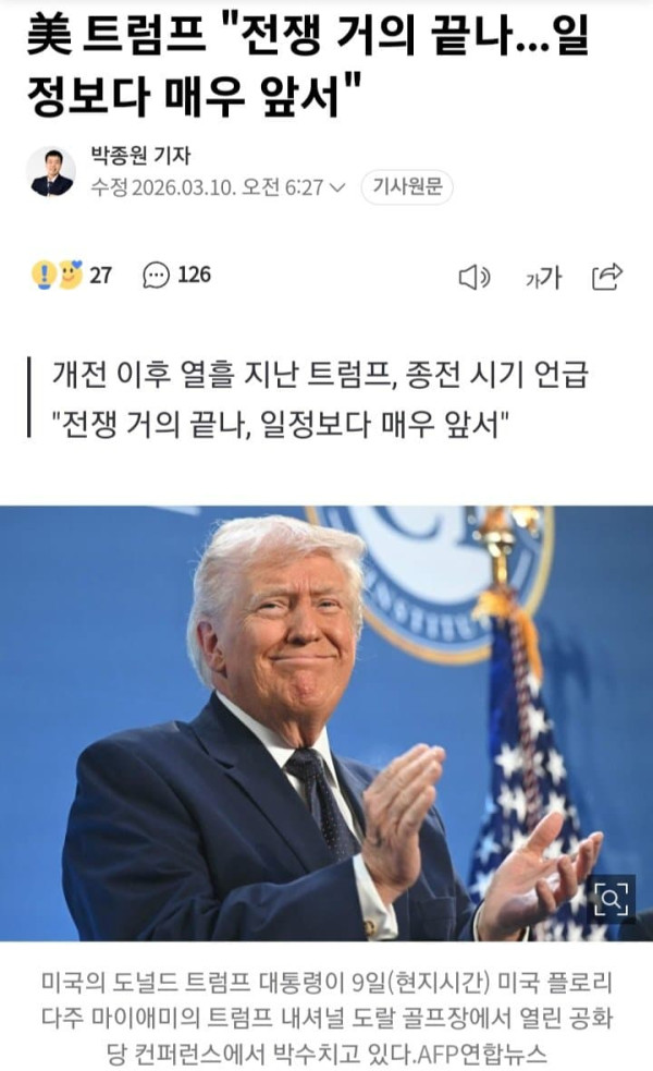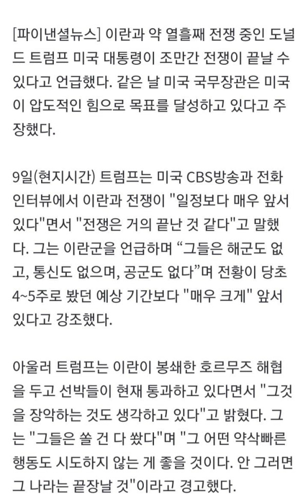이란과 약 열흘째 전쟁 중인 도널드 트럼프 미국 대통령이 조만간 전쟁이 끝날 수 있다고 언급했다. 같은 날 미국 국무장관은 미국이 압도적인 힘으로 목표를 달성하고 있다고 주장했다. 9일(현지시간) 트럼프는 미국 CB