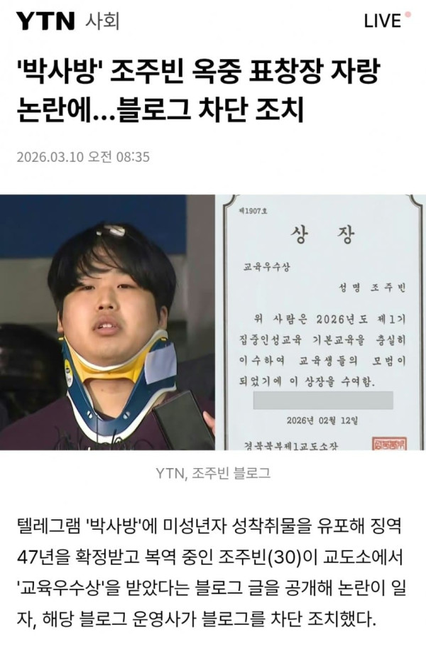 텔레그램 ‘박사방’ 운영자로 성 착취물을 제작·유포한 ‘n번방’ 사건 핵심인물이자 미성년자 성폭행으로 징역 총 47년 4개월을 확정받아 복역 중인 조주빈(30)이 또 다른 ‘옥중 블로그’를 운영 중인 정황이 알려졌다