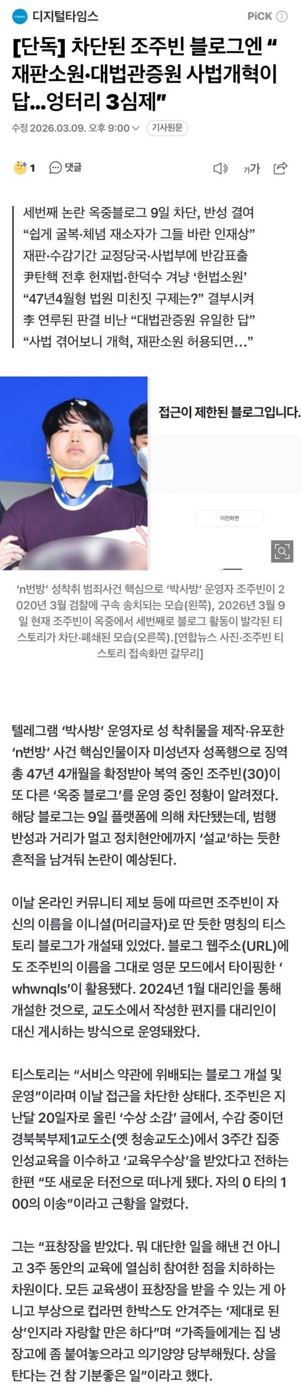 [단독] 차단된 조주빈 블로그엔 “재판소원·대법관증원 사법개혁이 답…엉터리 3심제”